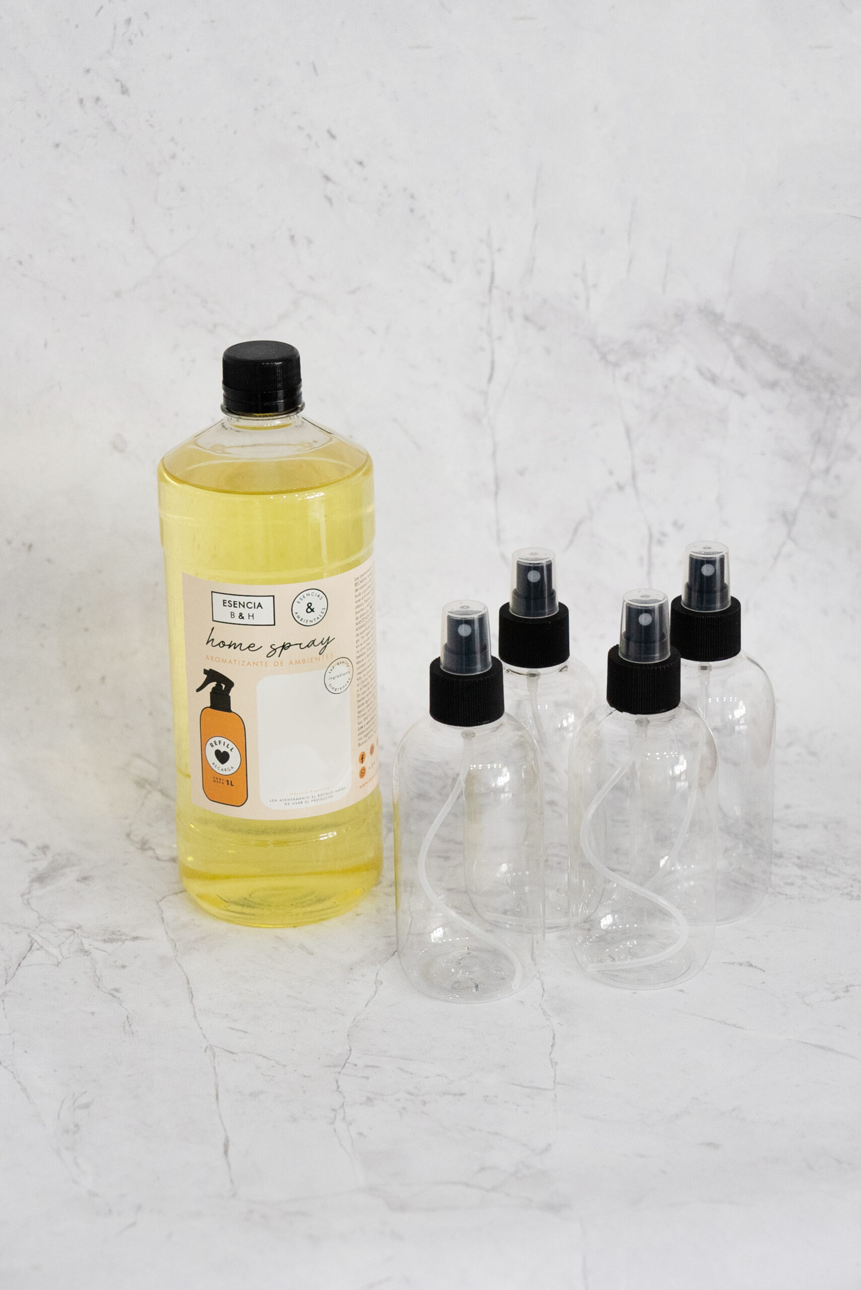 El mismo incluye: 4 envases pet 250ml cristal + 4 valvula spray + 1L home spray conc(aroma a elección entre los 5 aromas más vendidos)